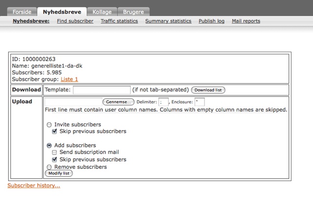 Hvis du ønsker at slette den eksisterende liste igen, udlæser du først filen via punktet "Download" og så indlæser den igen med klik i "Remove subscribers"